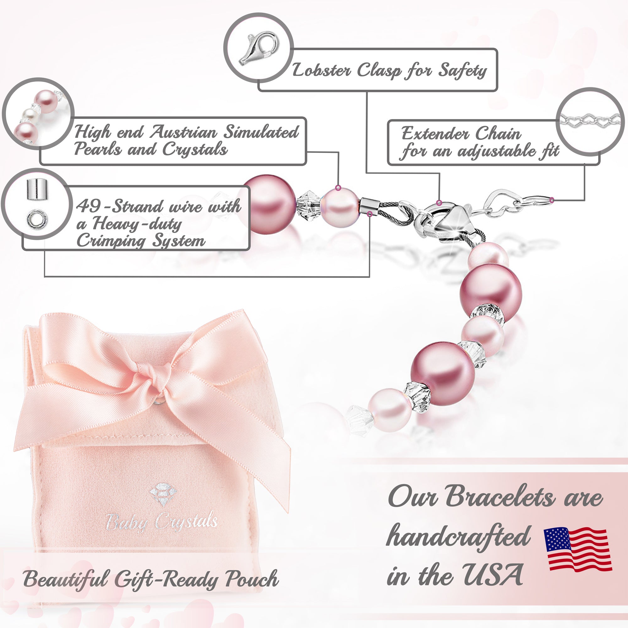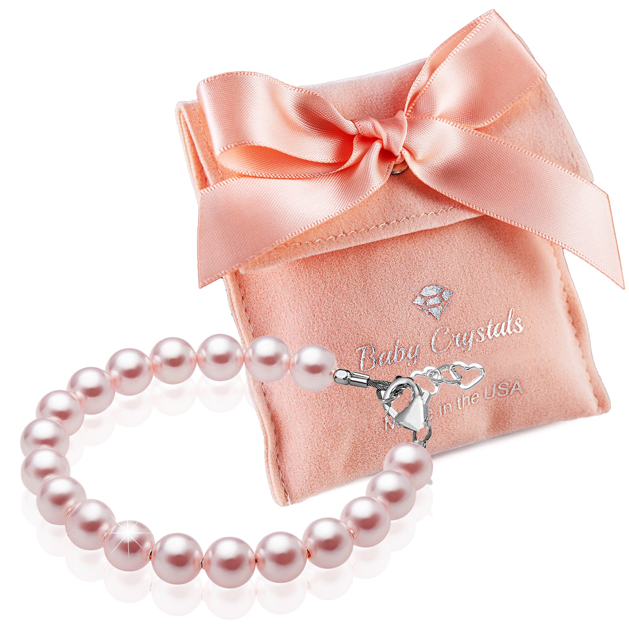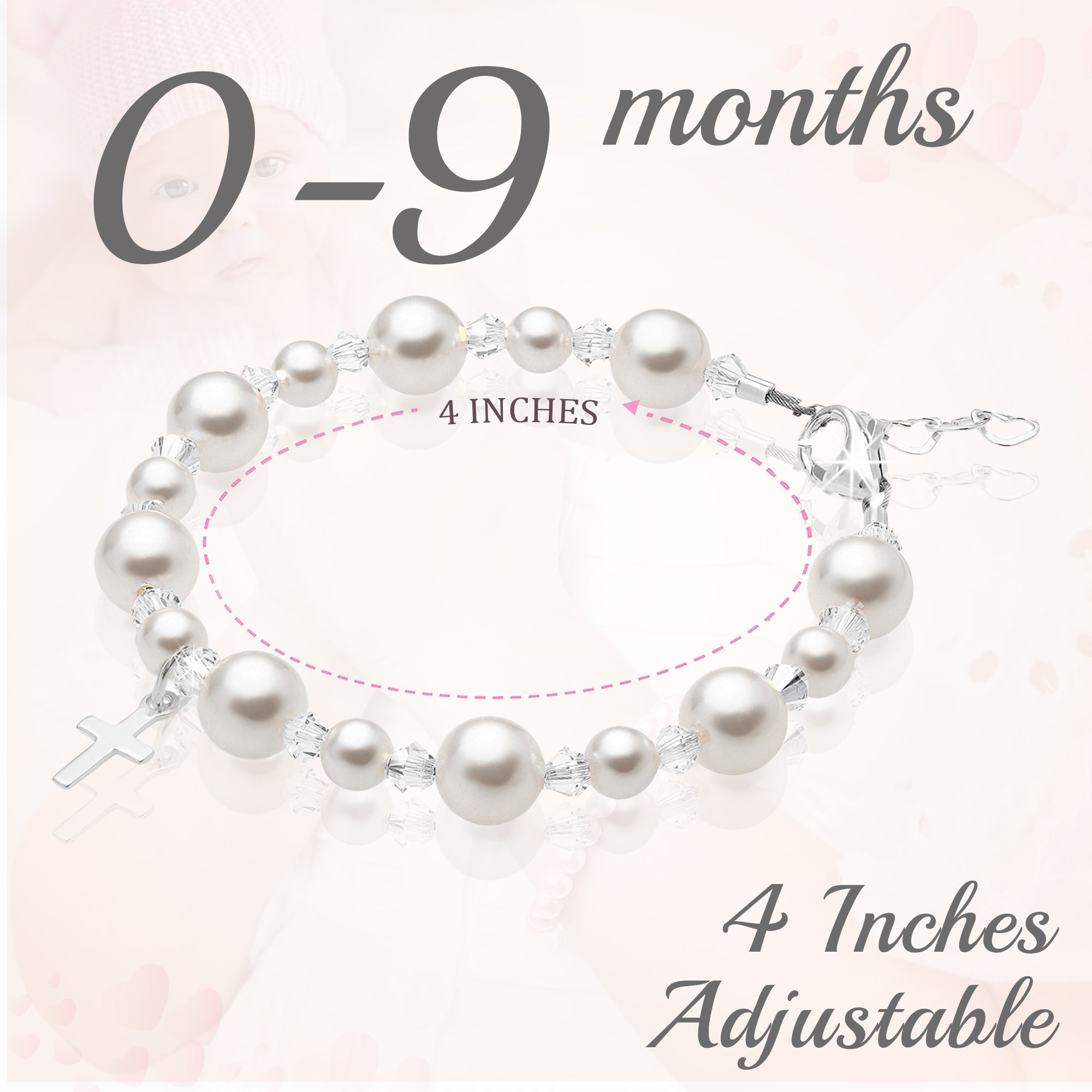 NewBorn Baby Girl Bracelet with Rose & White Pearls & Clear Crystals