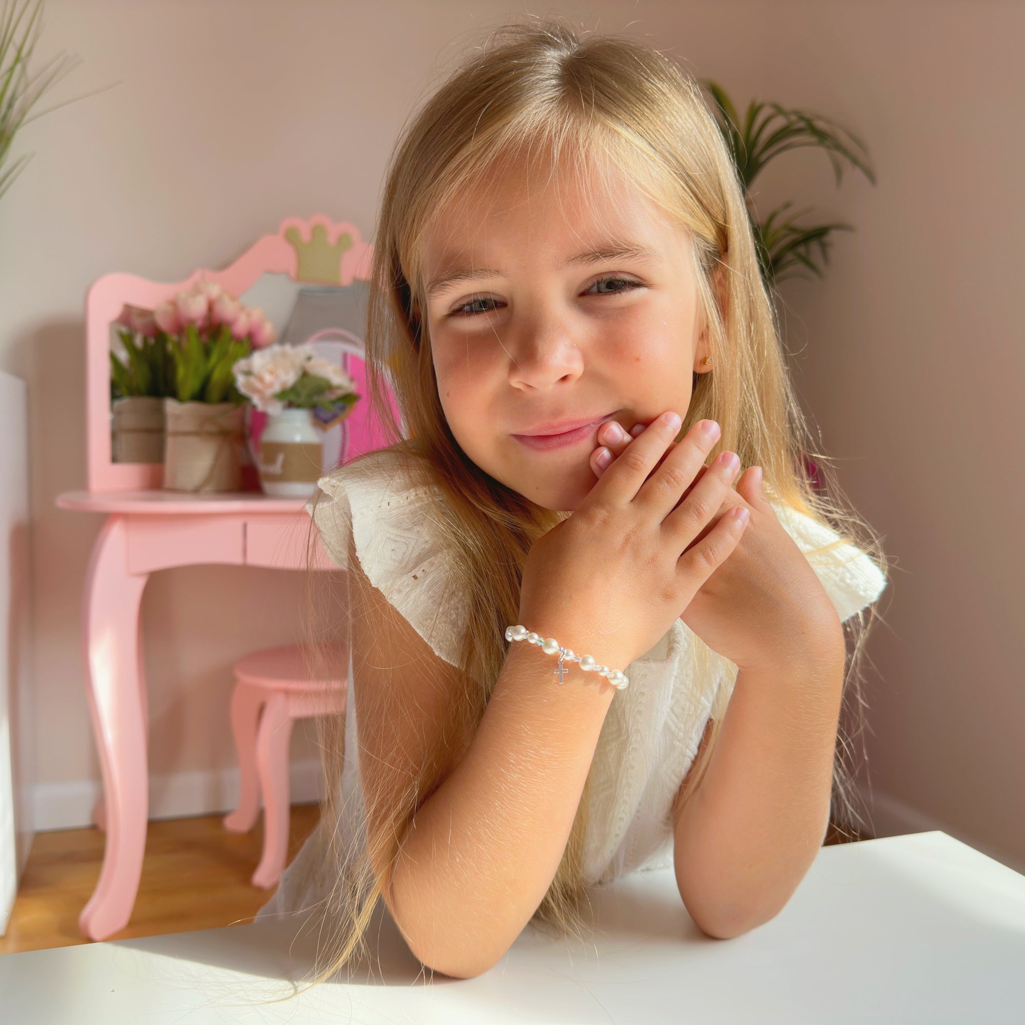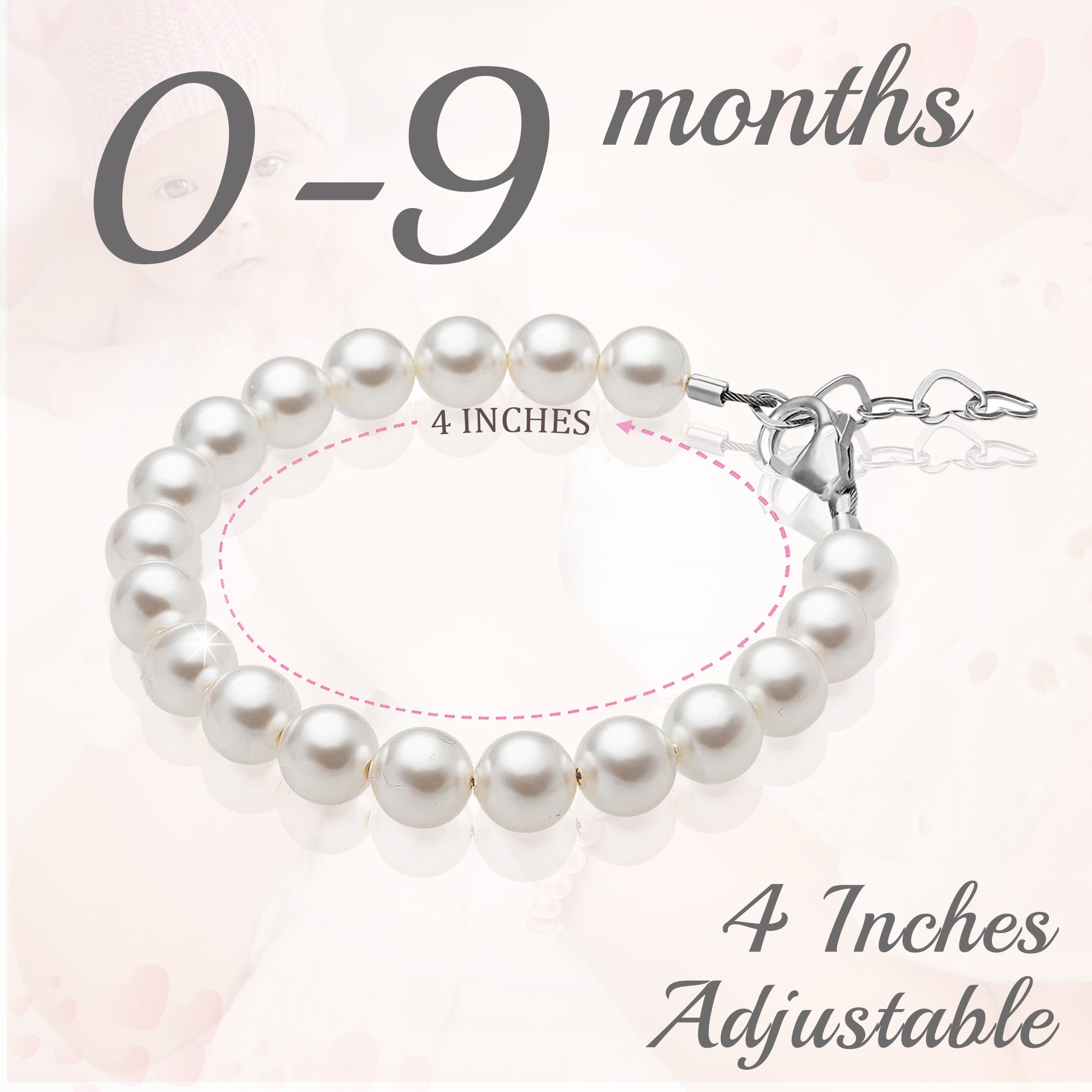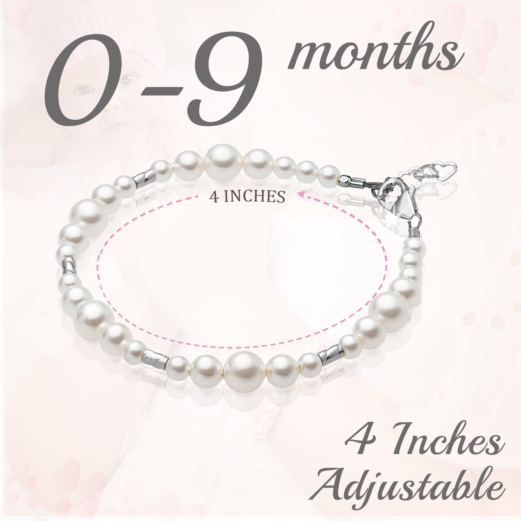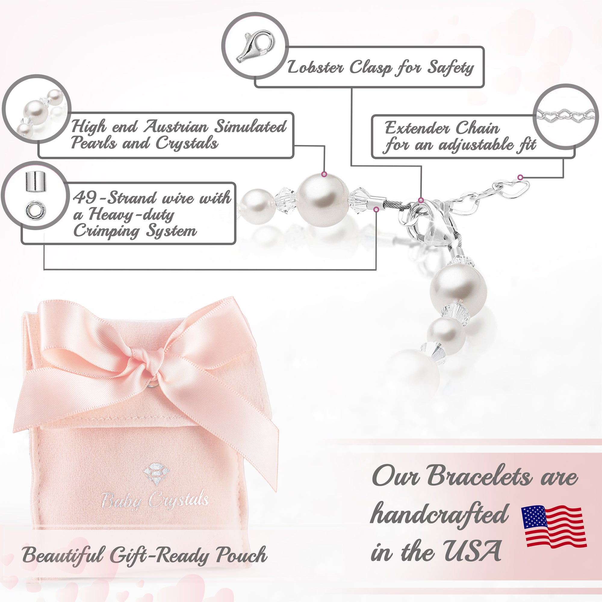 NewBorn Baby Girl Bracelet with Rose & White Pearls & Clear Crystals